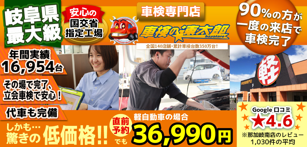 「車検の速太郎」 那加岐南店・可児店は、多くの各務原市・岐阜市・羽島郡(岐南町・笠松町)・関市・犬山市エリアのお客様のご愛顧を頂き、おかげさまで年間車検台数16,954台を突破!